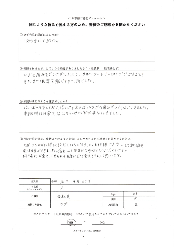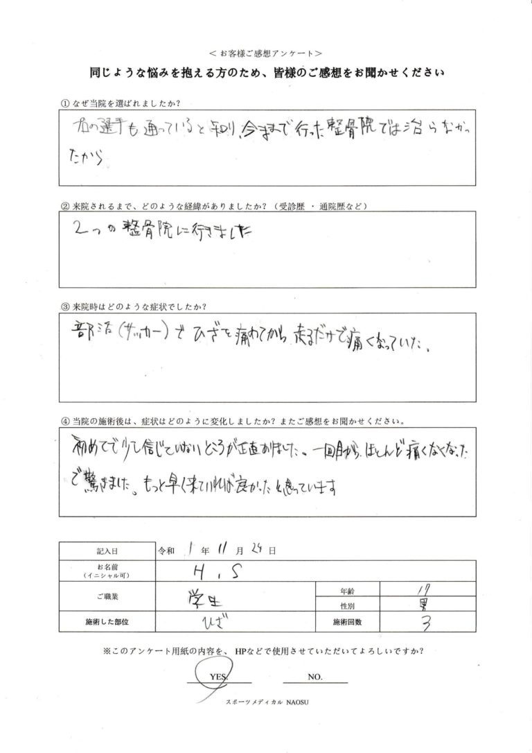 痛みがとれて、ボールを蹴るのも躊躇なくできるようになりました。