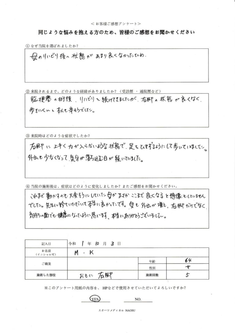 後遺症がある、父の施術をお願いし、10分後には信じれなぐらい麻痺の状態が改善され、驚愕しました。
