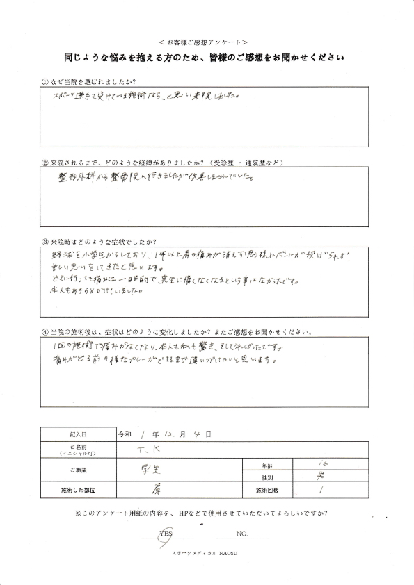 痛みが改善して、バットもボールもしっかり握れるようになりました。