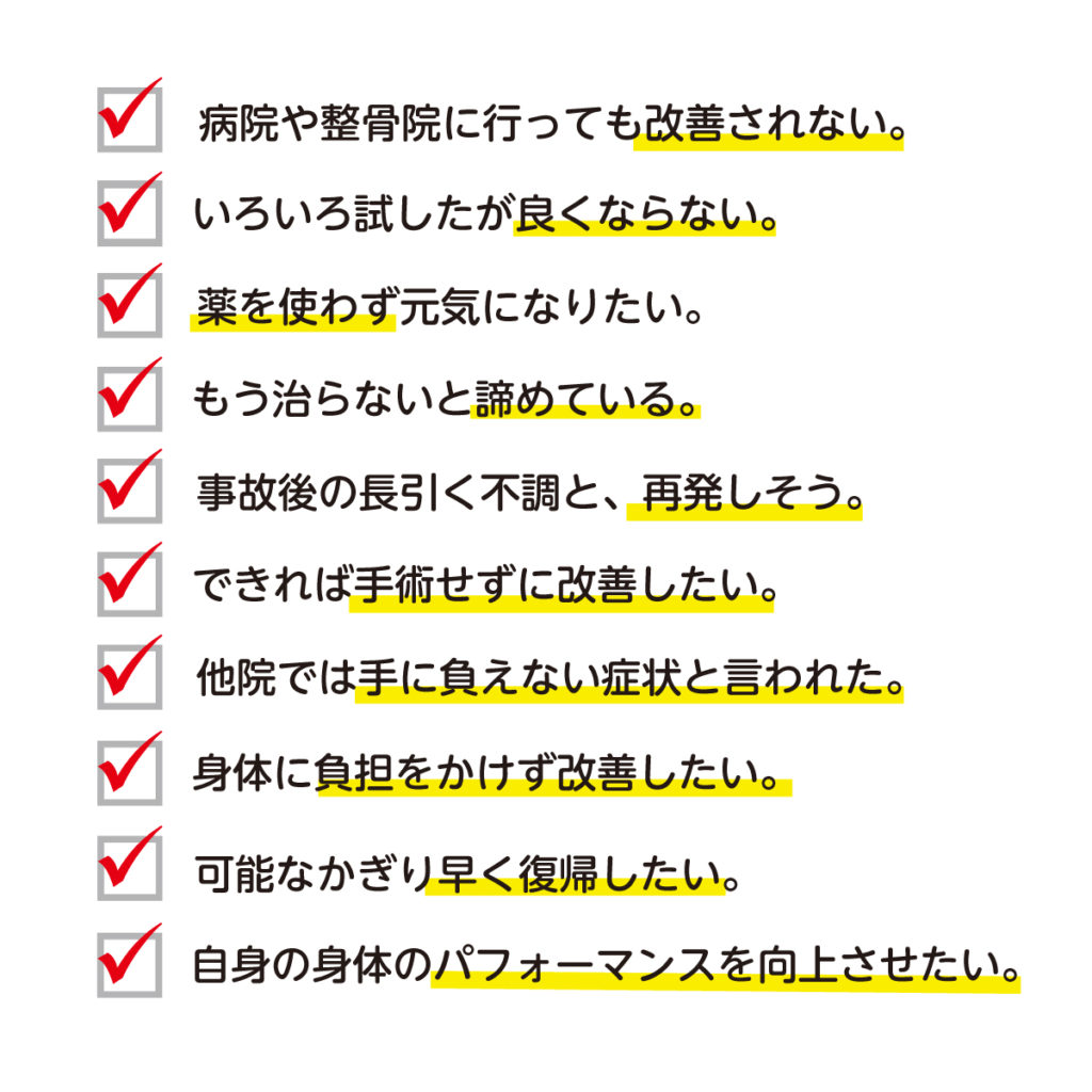 どこに行っても治らなかったと、お困りの方、お悩みの方のお力になること。「選手生命」を伸ばし、プロ選手・アスリートが長く活躍できるようにサポートすること、後遺症や、仕事柄身体を酷使させて、痛みと戦っている方、諦めてしまっている方のお力になることを信念に、日々奔走中です。