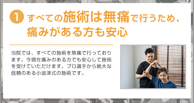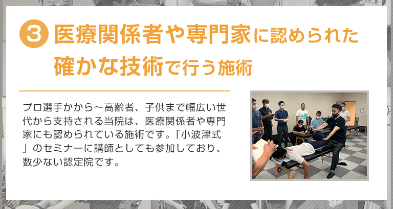 これまでに2万人以上の患者を施術し、どこに行っても良くならなかった症状をアプローチ、施術を行ってきました。現在では、プロバスケット選手などのサポートや、東京、大阪などで小波津式認定講師として指導し、上海、北京などでも施術を行っています。