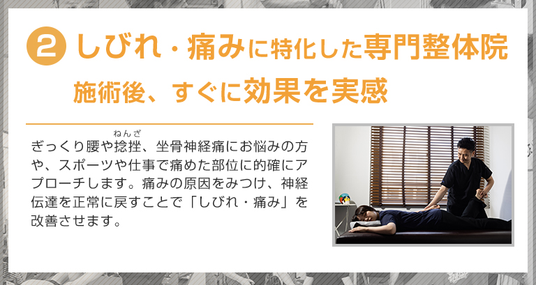 症状・部位に適した施術を行います。症状によって、術後すぐに効果を感じていただけます。※効果の体感は個人差がございます。