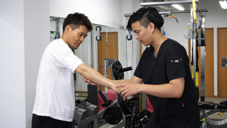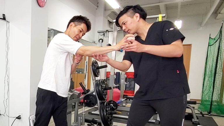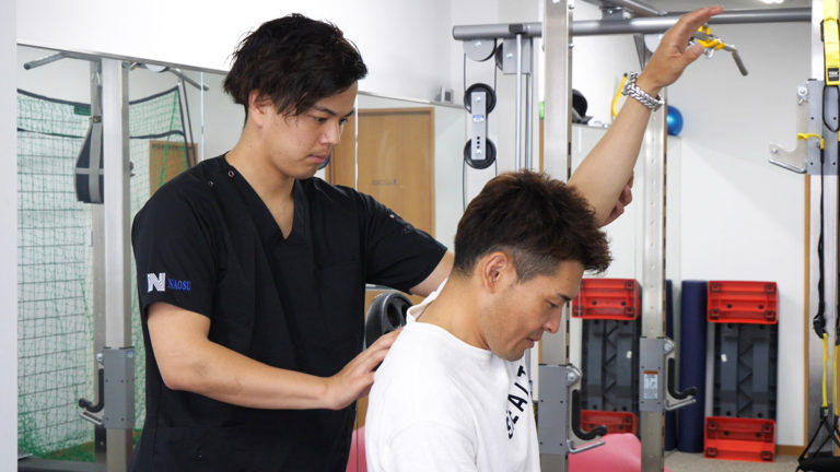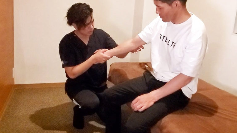 触診してもやはり可動域は狭く激しい痛みがあるようです。他の部位に問題がないかを確認します。