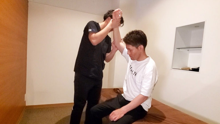 肩の施術は座った状態で行います。