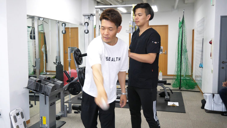 ボールを使って投球フォームでの動作確認も可能です。施術前との違いを感じらると思います。